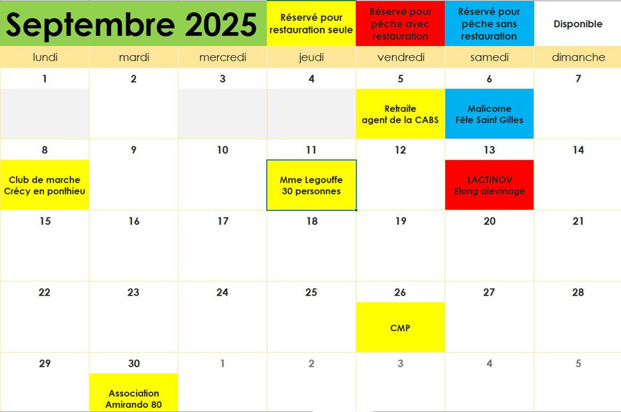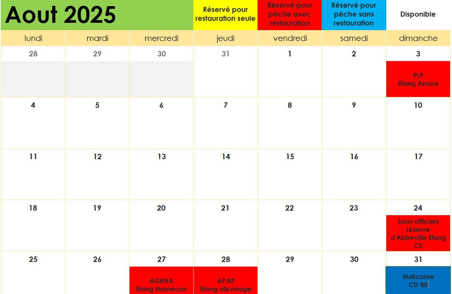 ou au 06.81.43.06.85 ou à plp@plpabbeville.fr pour réserver un étang ( réservé aux associations) et/ou notre structure de restauration, nous vous remercions de bien vouloir consulter les disponibilités ci-dessous.
